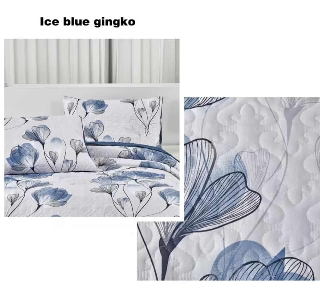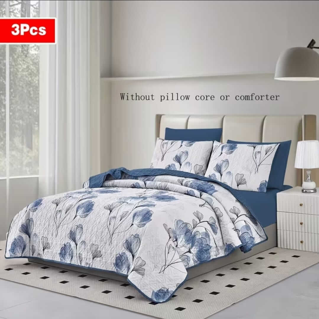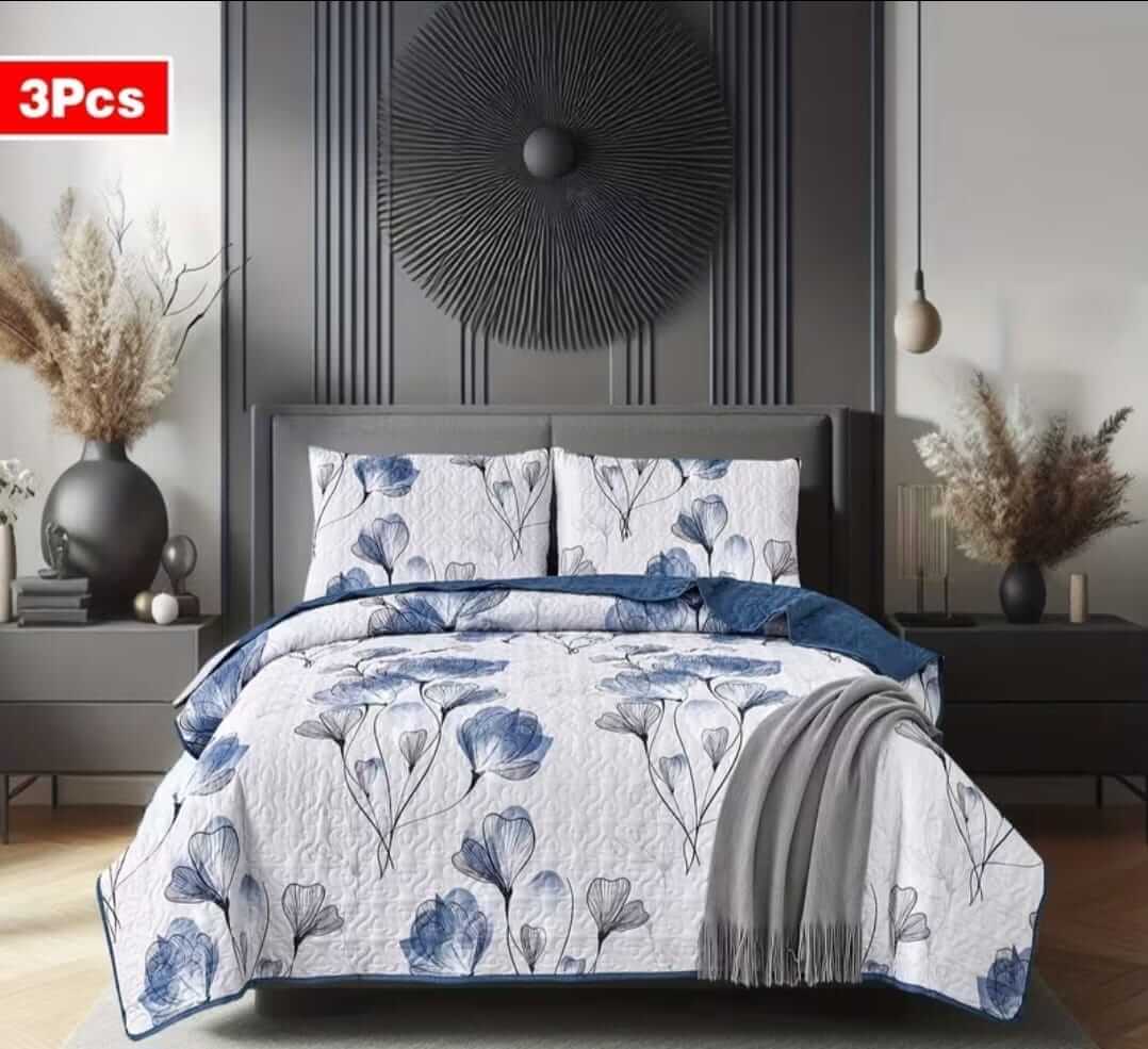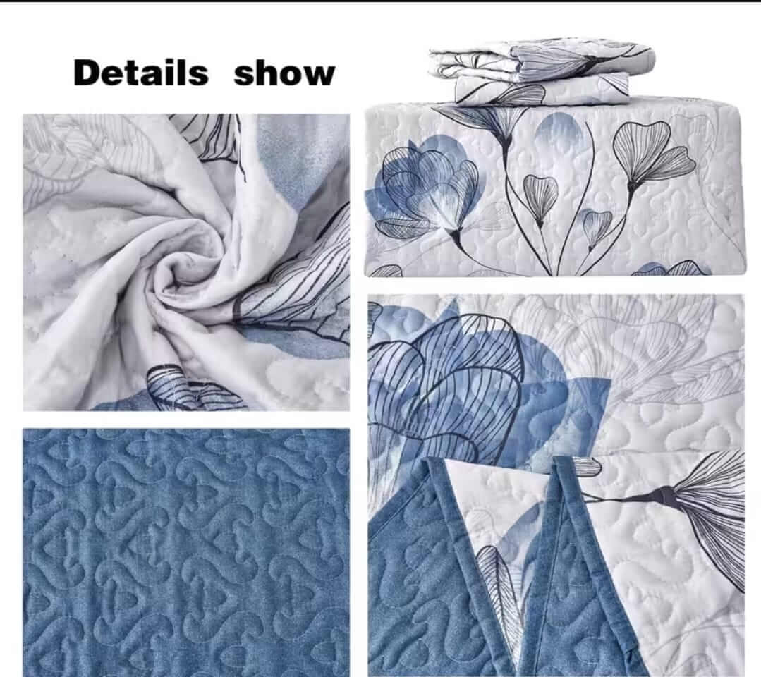 White Base Blue Floral Coverlet Set-Quilted Bedspread Sets (3Pcs)