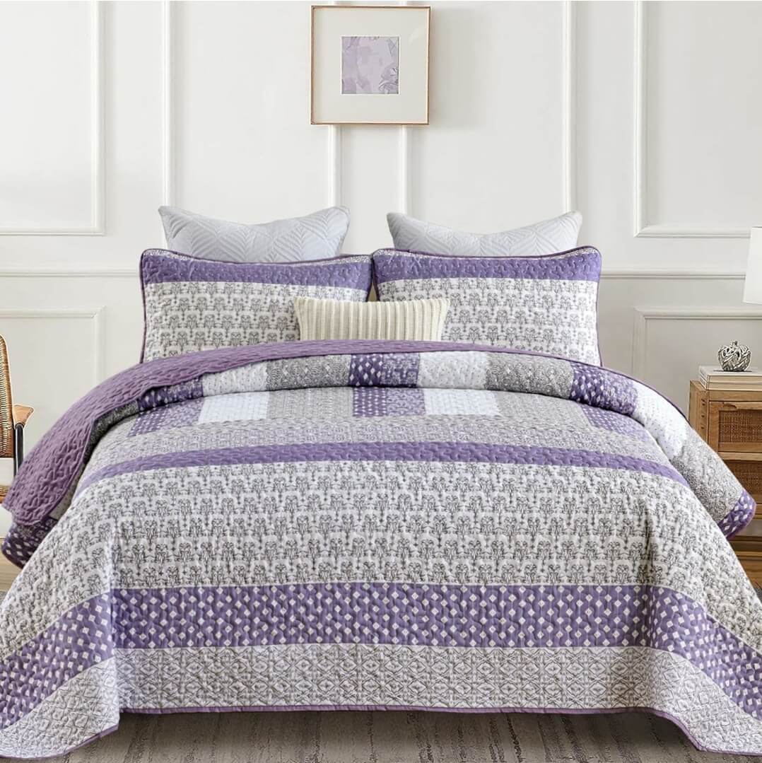 Purple Striped Patchwork Bedspread Coverlet Sets (3Pcs)