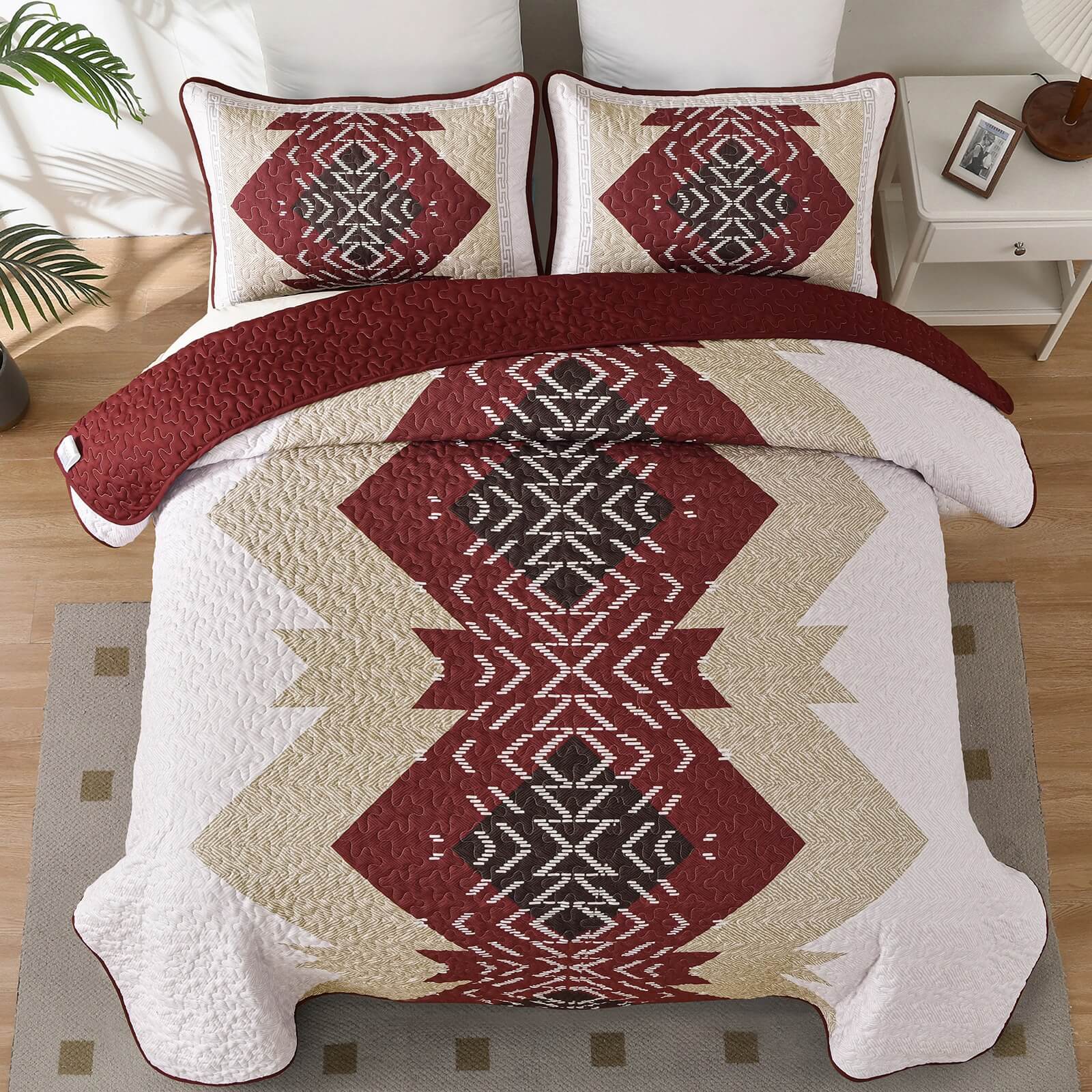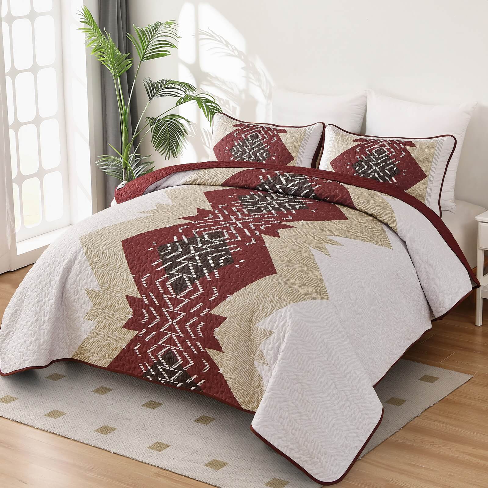 Bohemian Tribal Red Geometric Quilted Bedspread Coverlet Set (3Pcs)