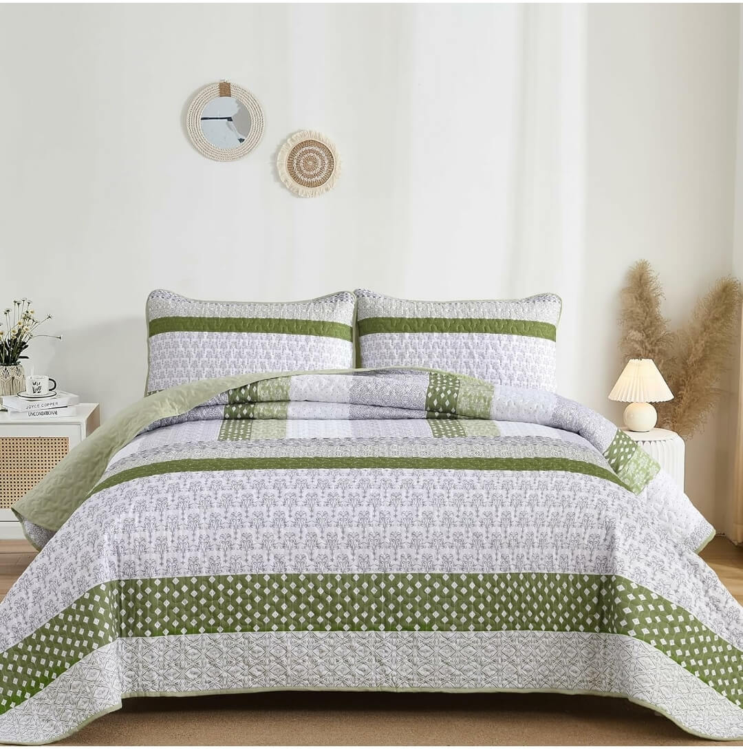 Oilve Green Striped Coverlet Set-Quilted Bedspread Sets (3Pcs)