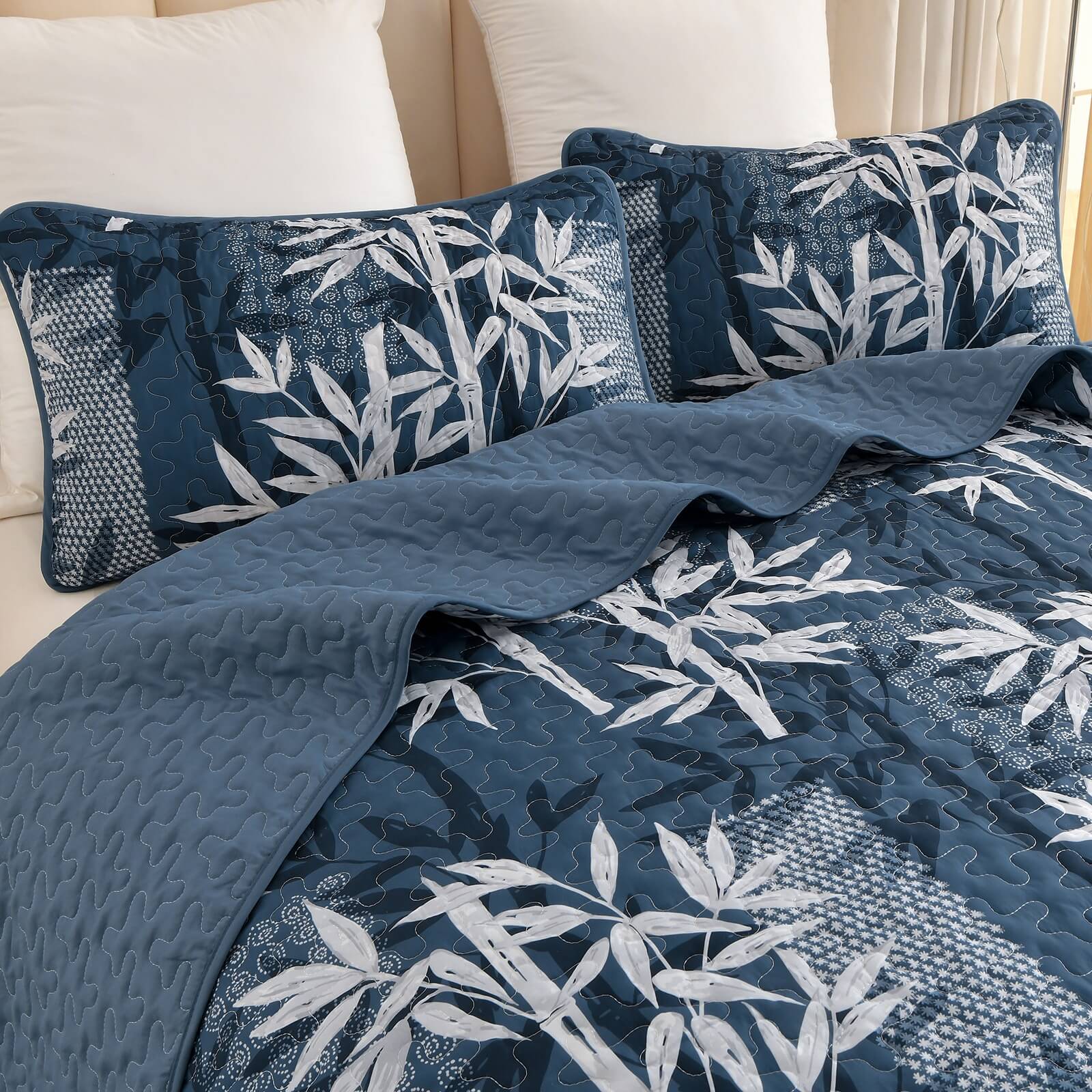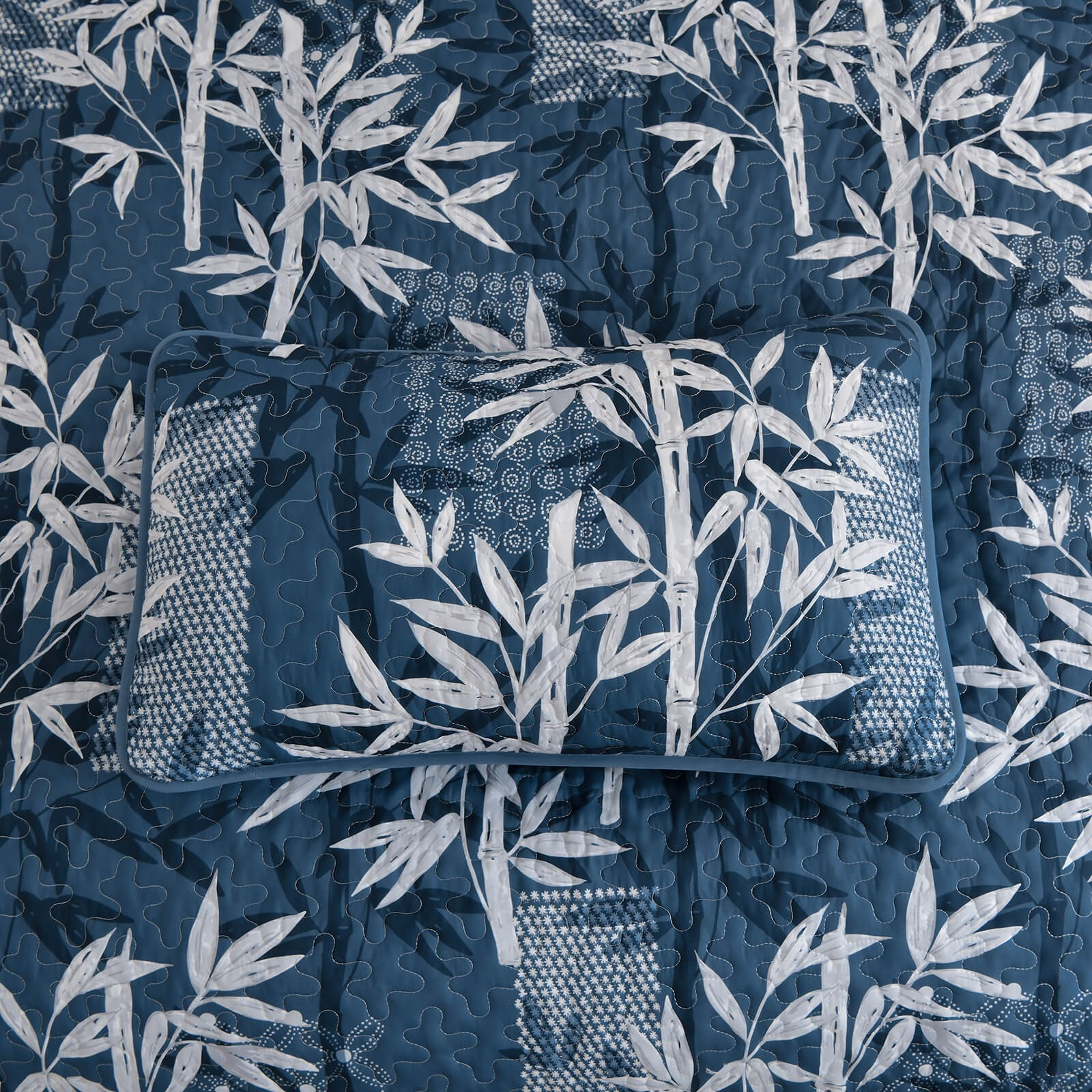 Dark Blue Botanical Quilted Bedspread Coverlet Set (3Pcs)