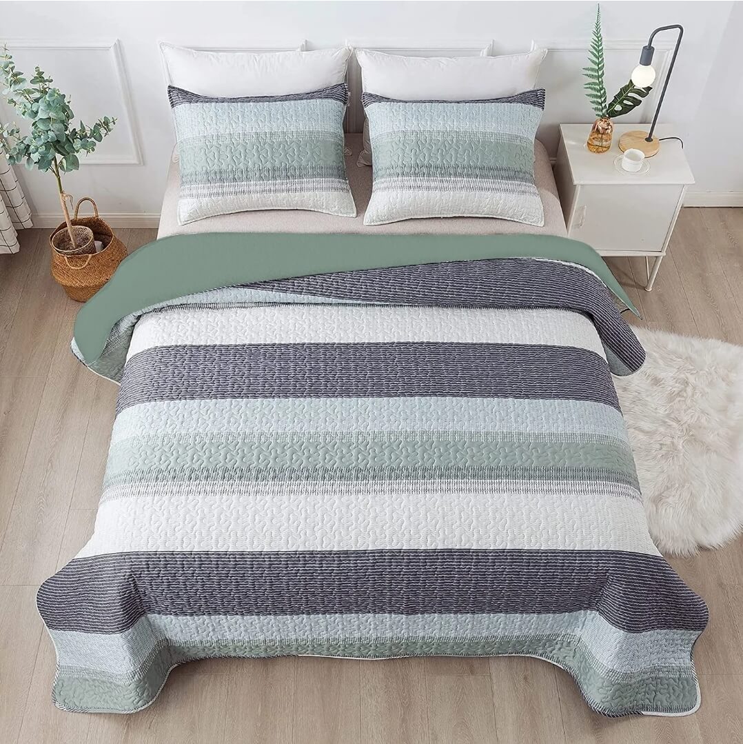 New Green Striped Coverlet Set-Quilted Bedspread Sets (3Pcs)