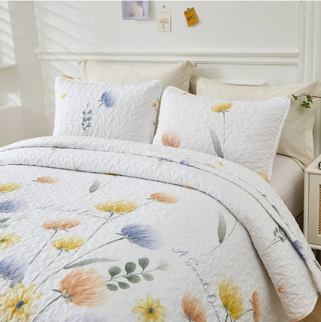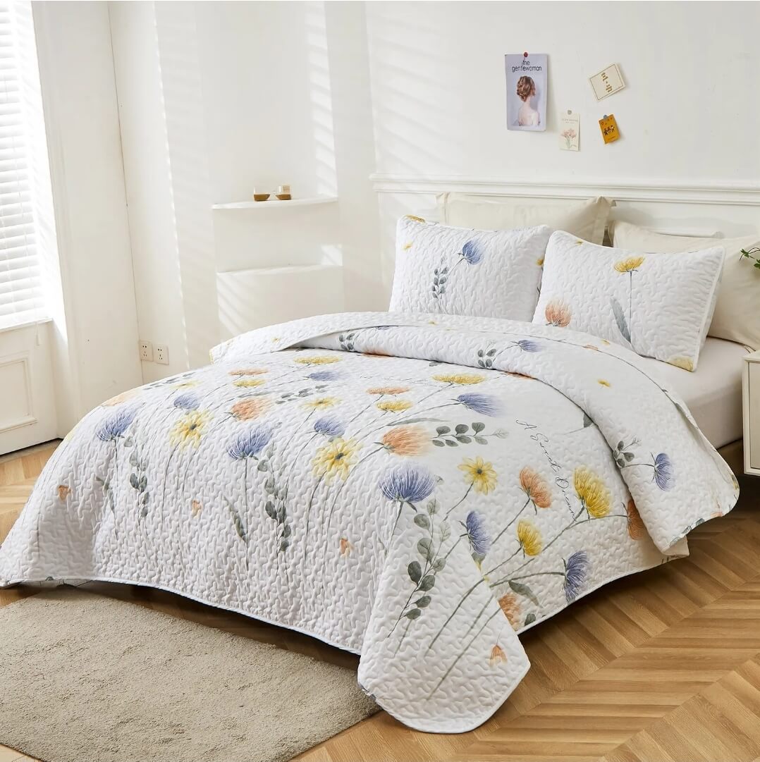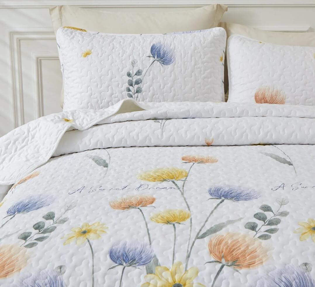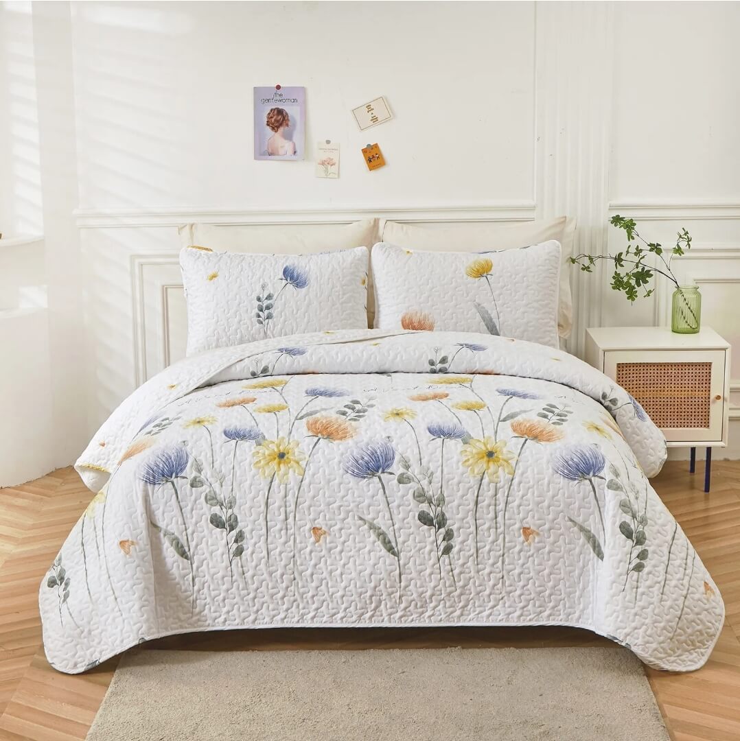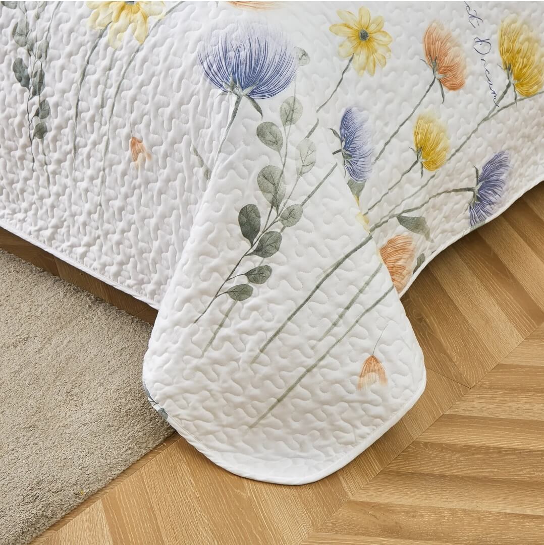 White Base Multicolor Floral Coverlet Set-Patchwork Quilted Bedspread Sets (3Pcs)