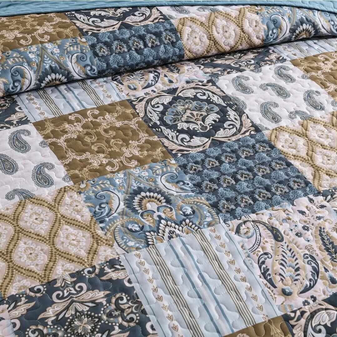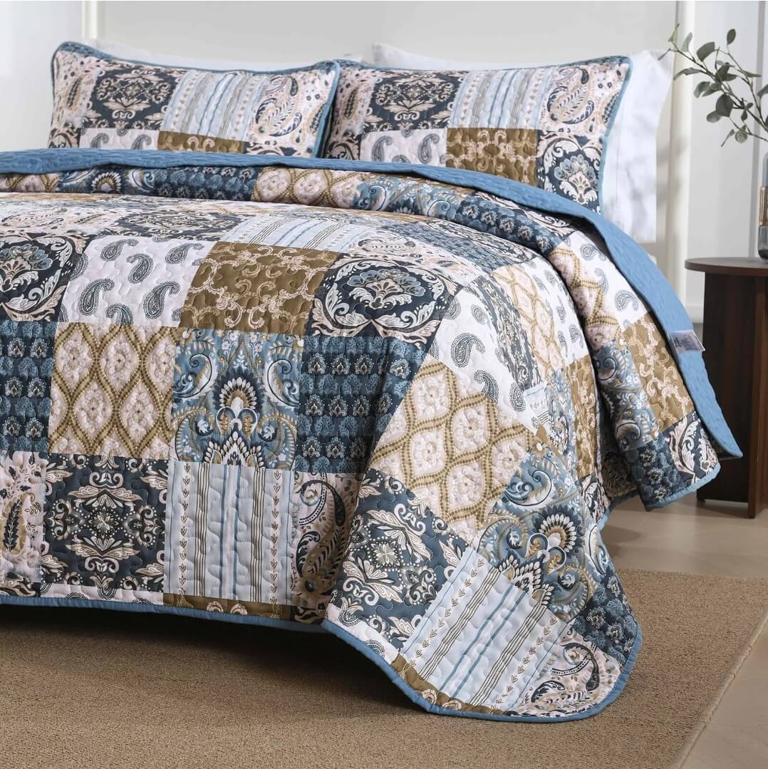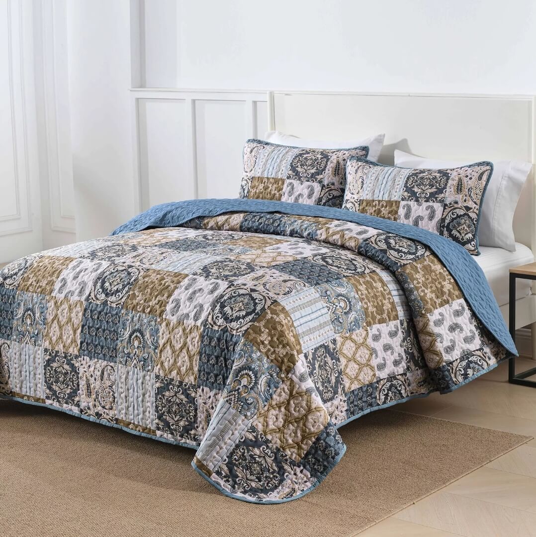 2025 Blue Checked Quilted Bedspreads Coverlet Set (3Pcs)