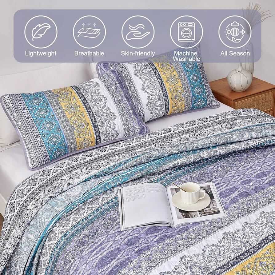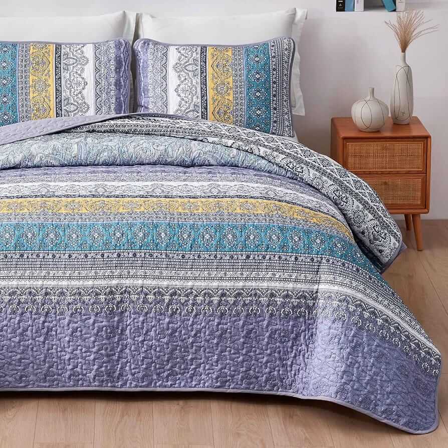 Purple Bohemian Striped Quilted Bedspread Coverlet Set (3Pcs)