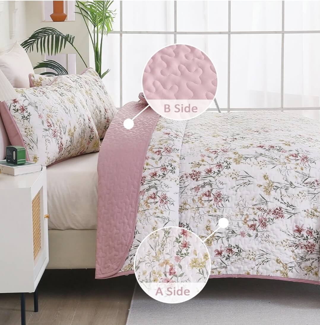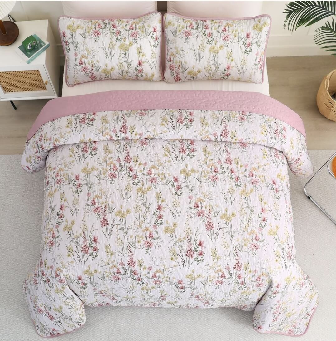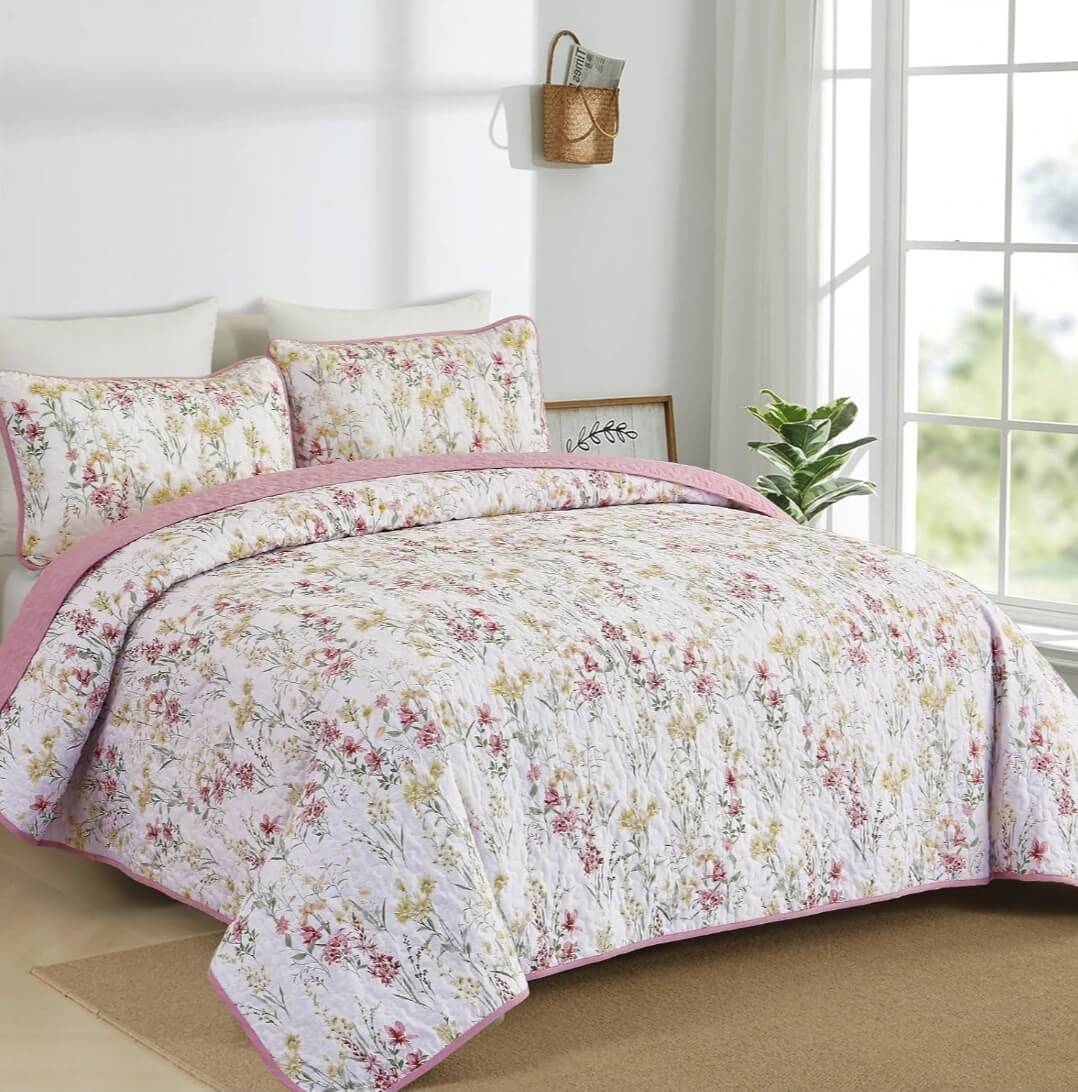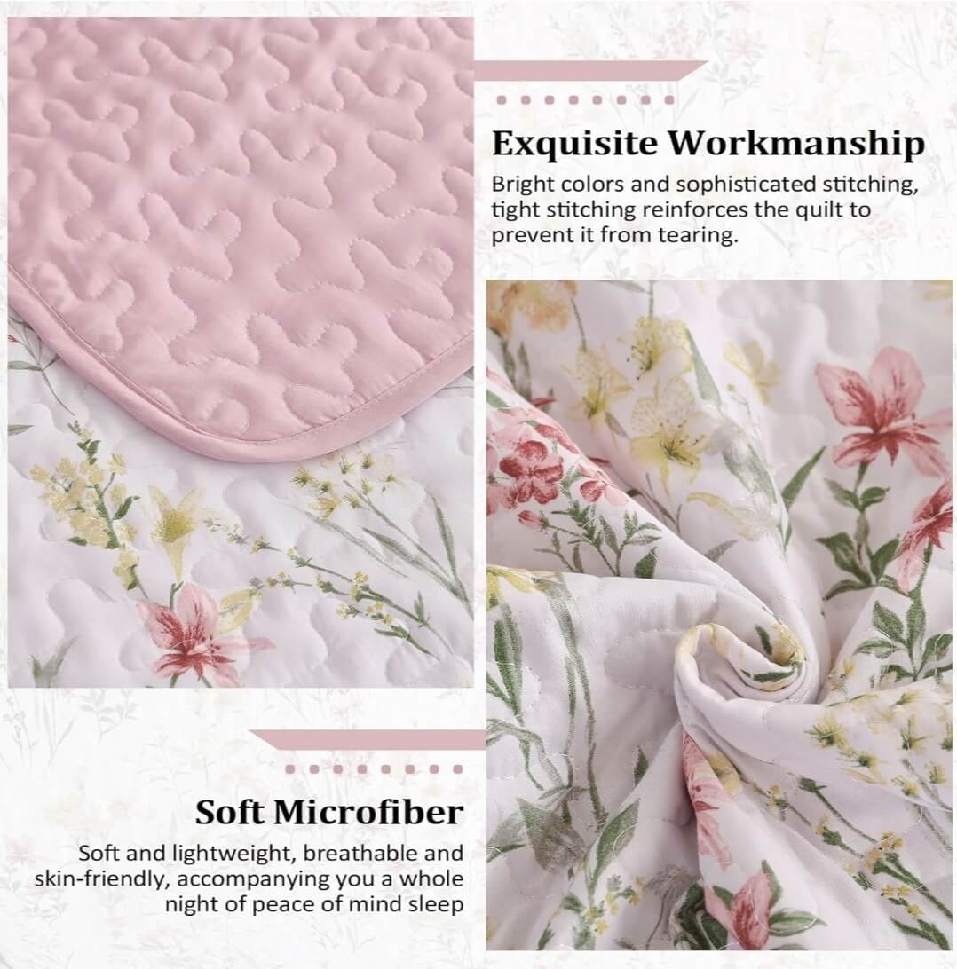 2025 Pink Floral Coverlet Set-Quilted Bedspread Sets (3Pcs)