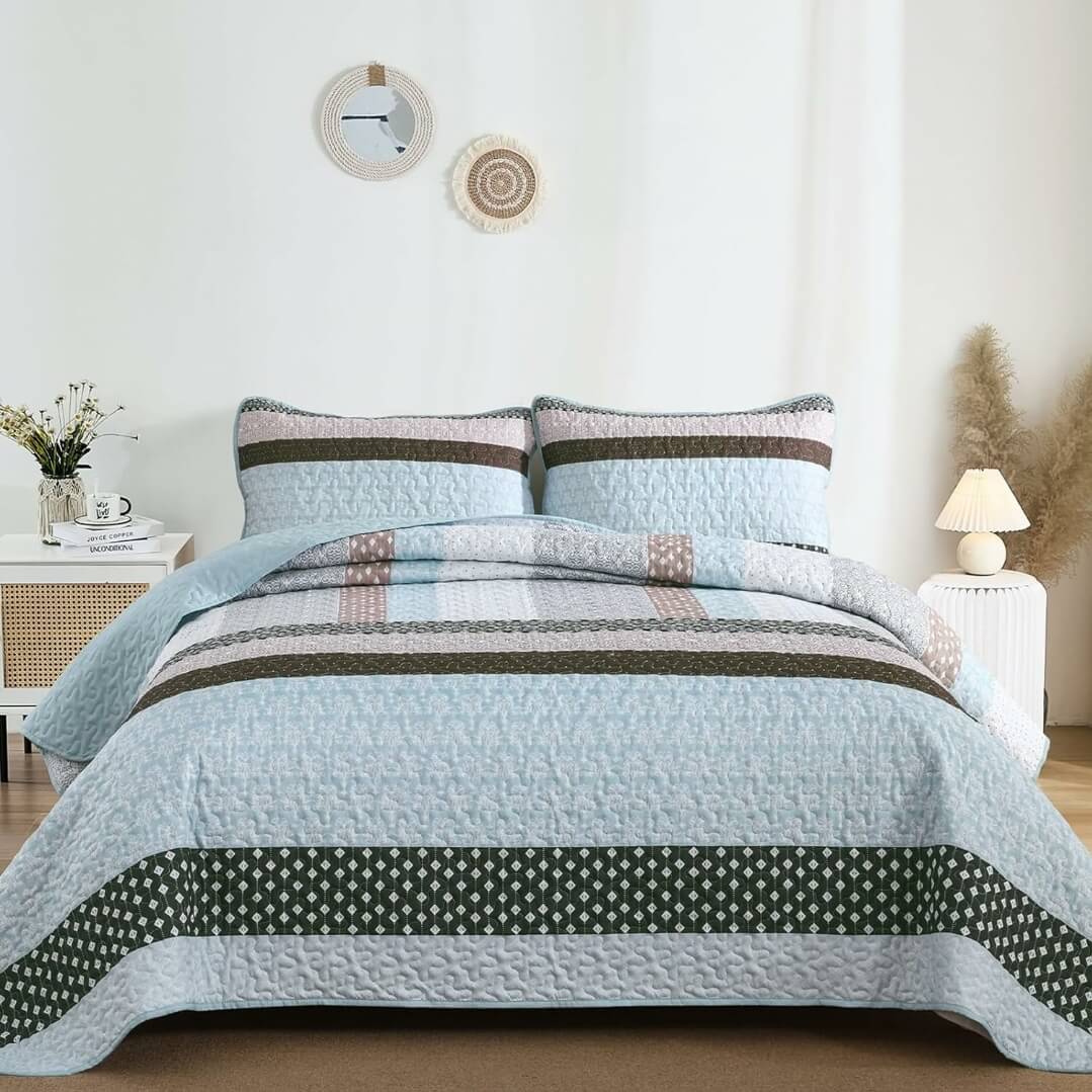 Cream & Earth Tones Quilted Bedspread Set-Rustic Patchwork Coverlet (3Pcs)