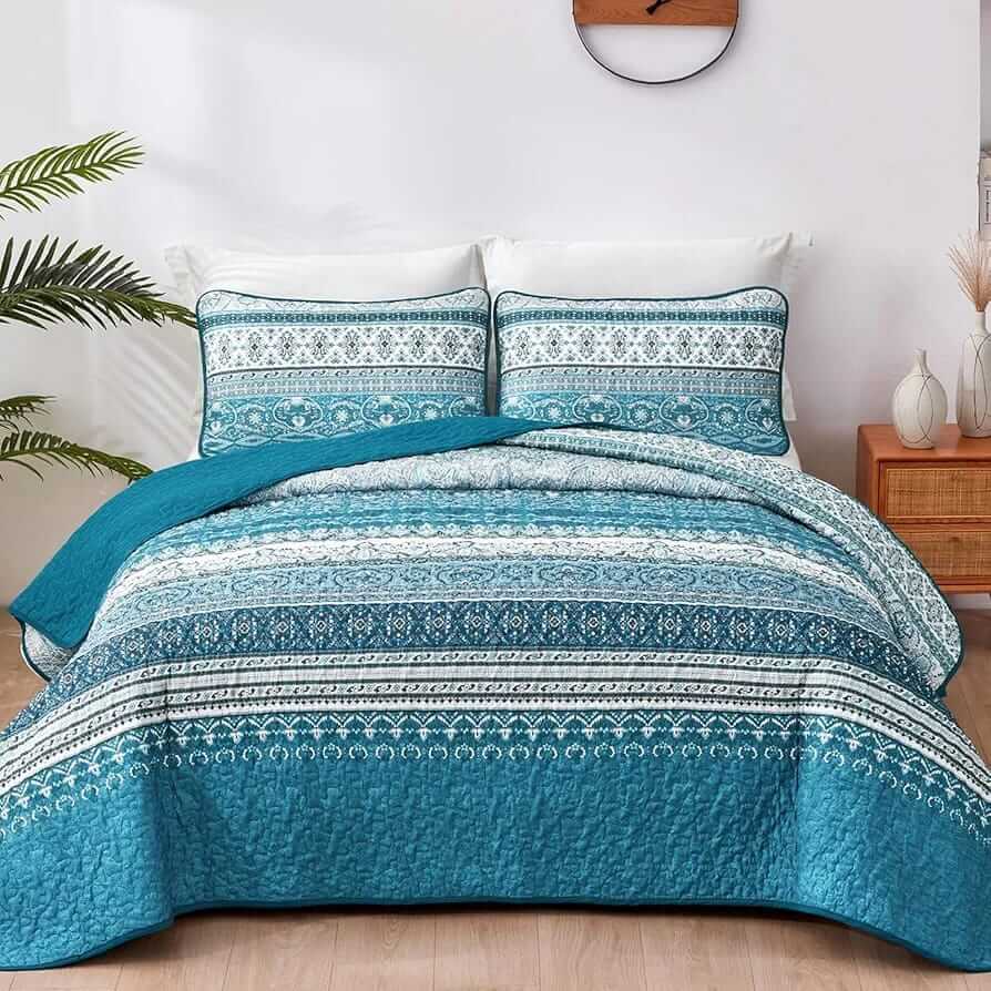 Teal Bohemian Striped Quilted Bedspread Coverlet Set (3Pcs)