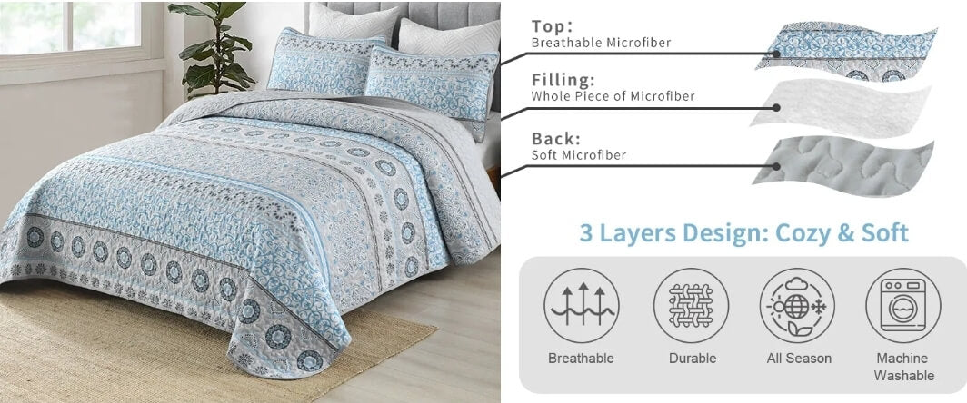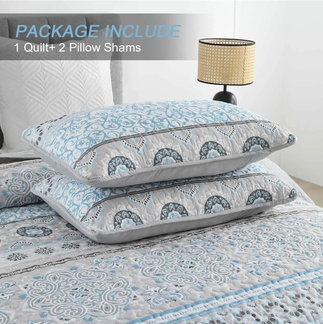 Blue Greyish Bedspread Set - Quilted Coverlet Set (3Pcs)