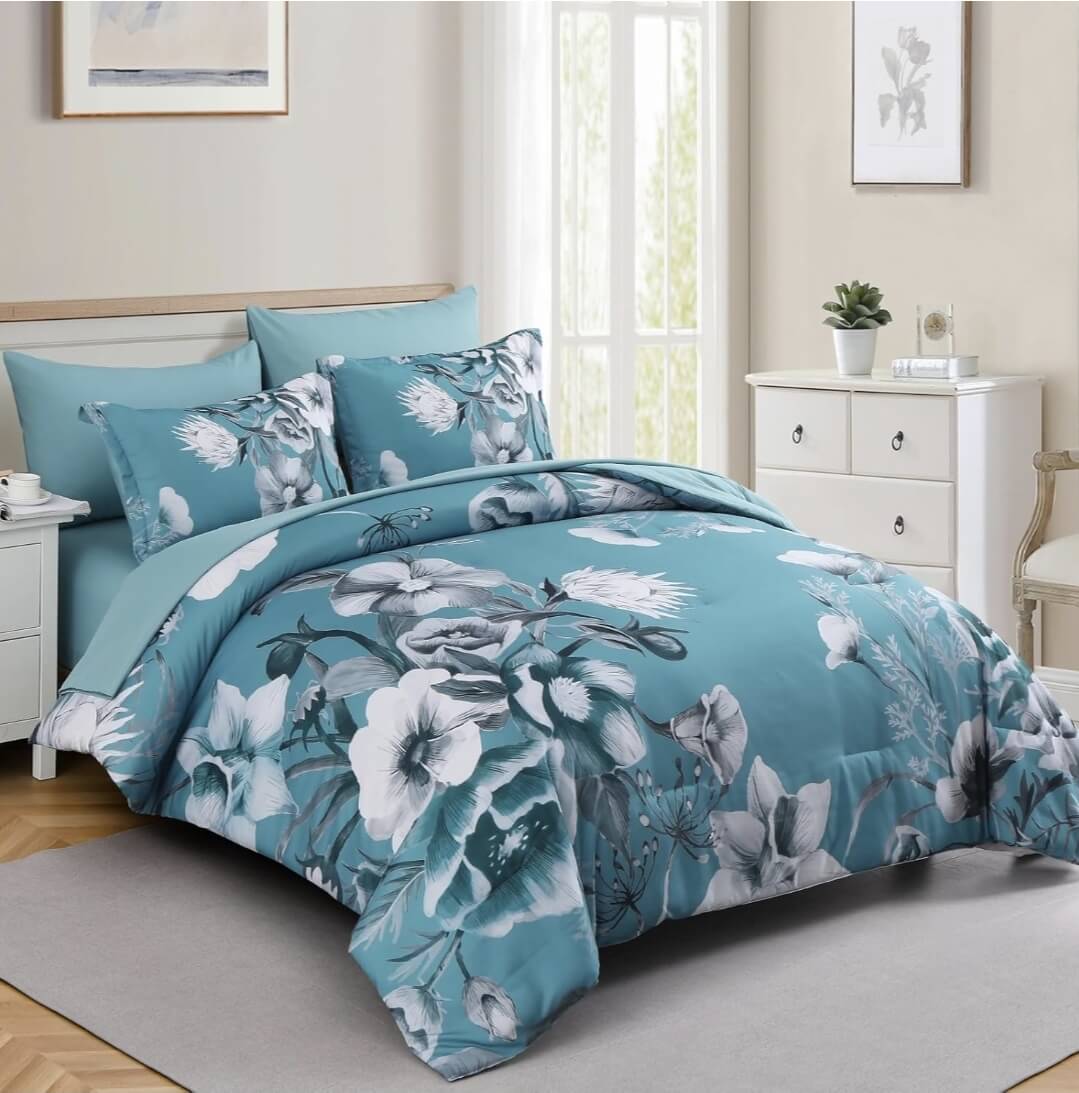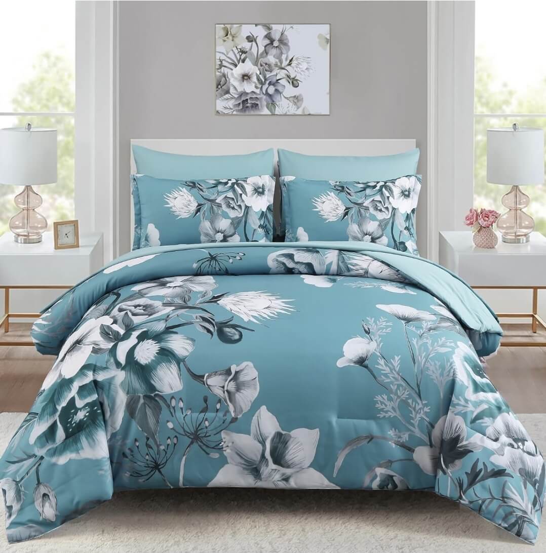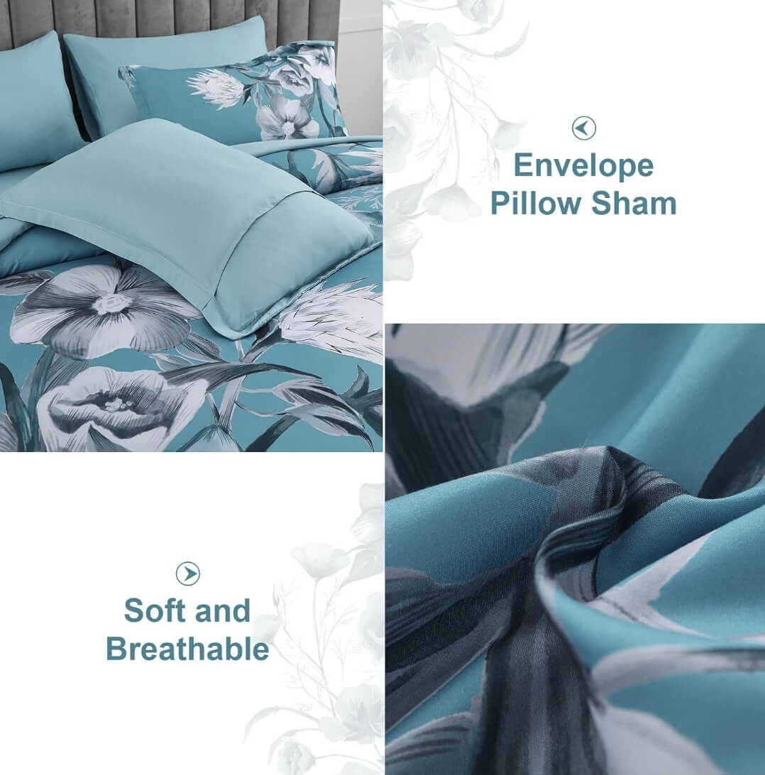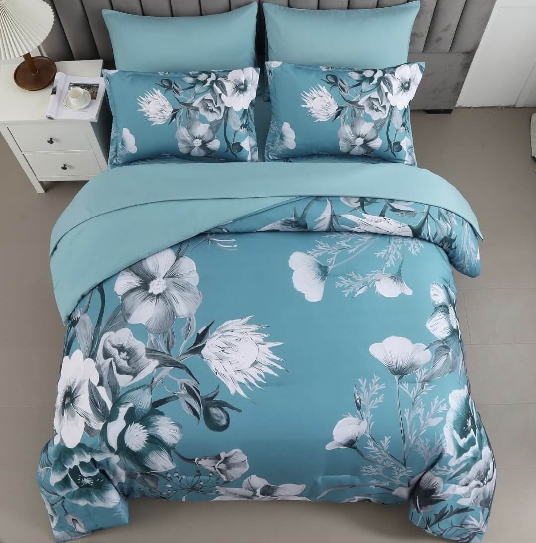 Teal Flower Comforter Set-Quilt Set (3Pcs)