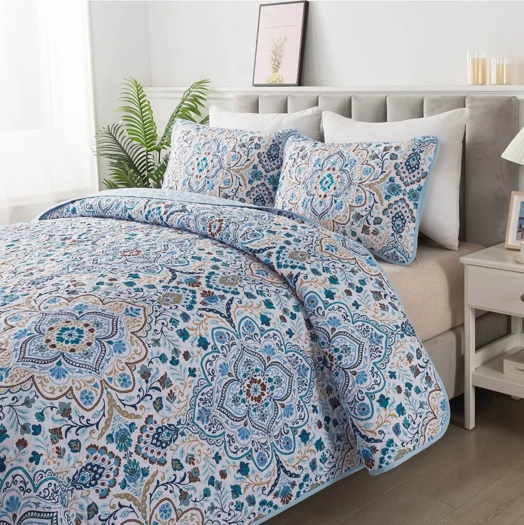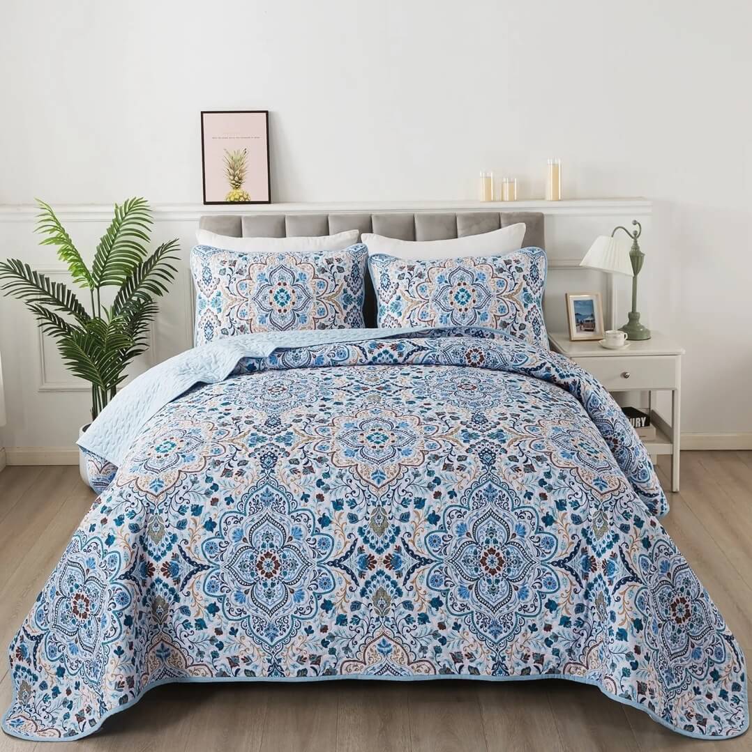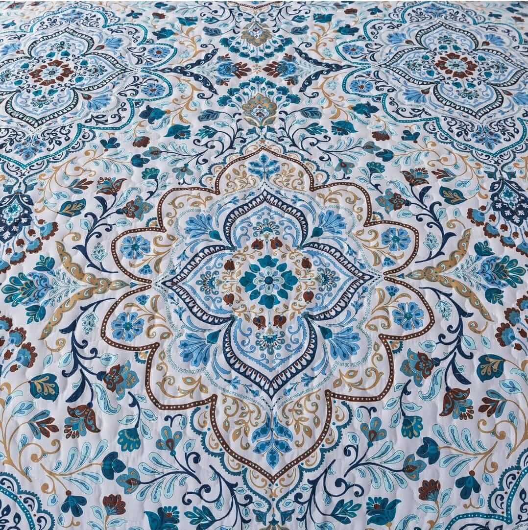 Blue INDIAN Coverlet Set-Floral Quilted Bedspread Sets (3Pcs)