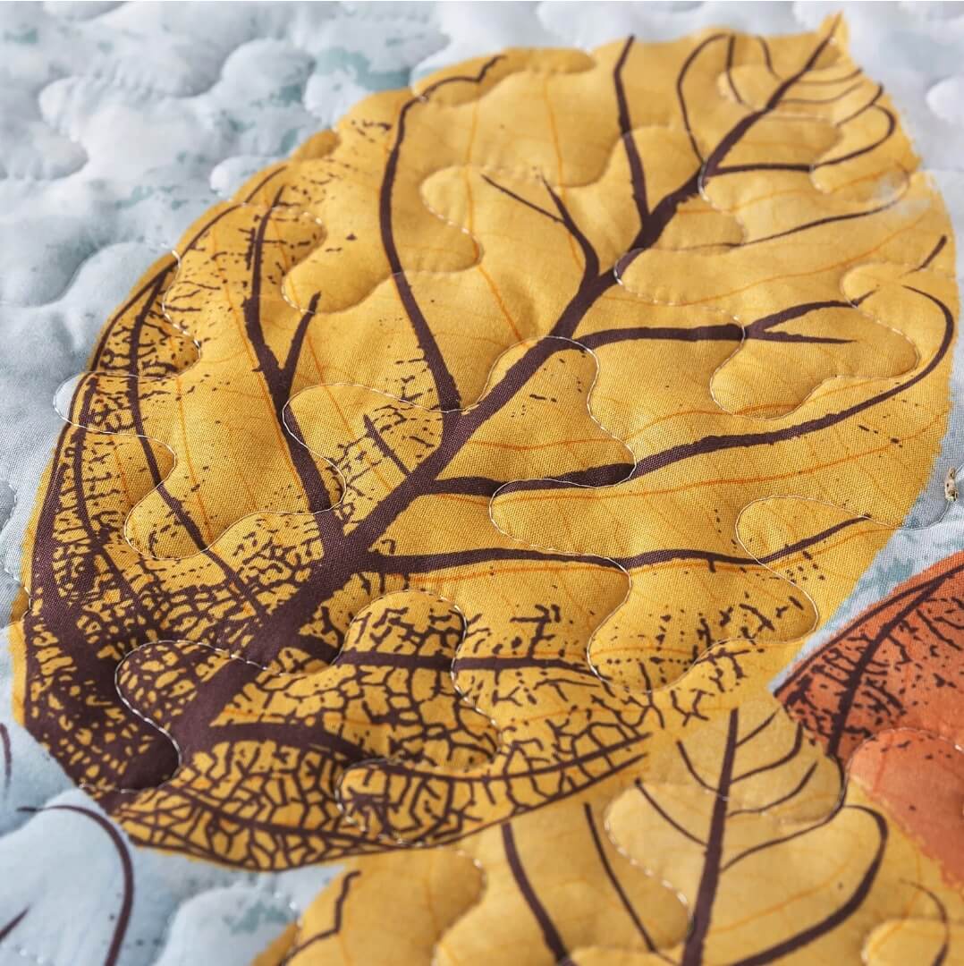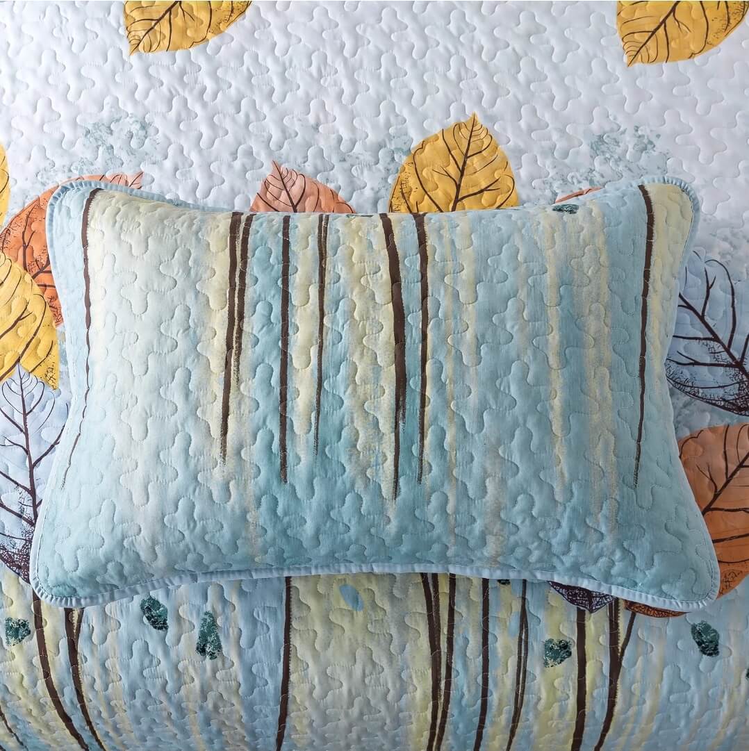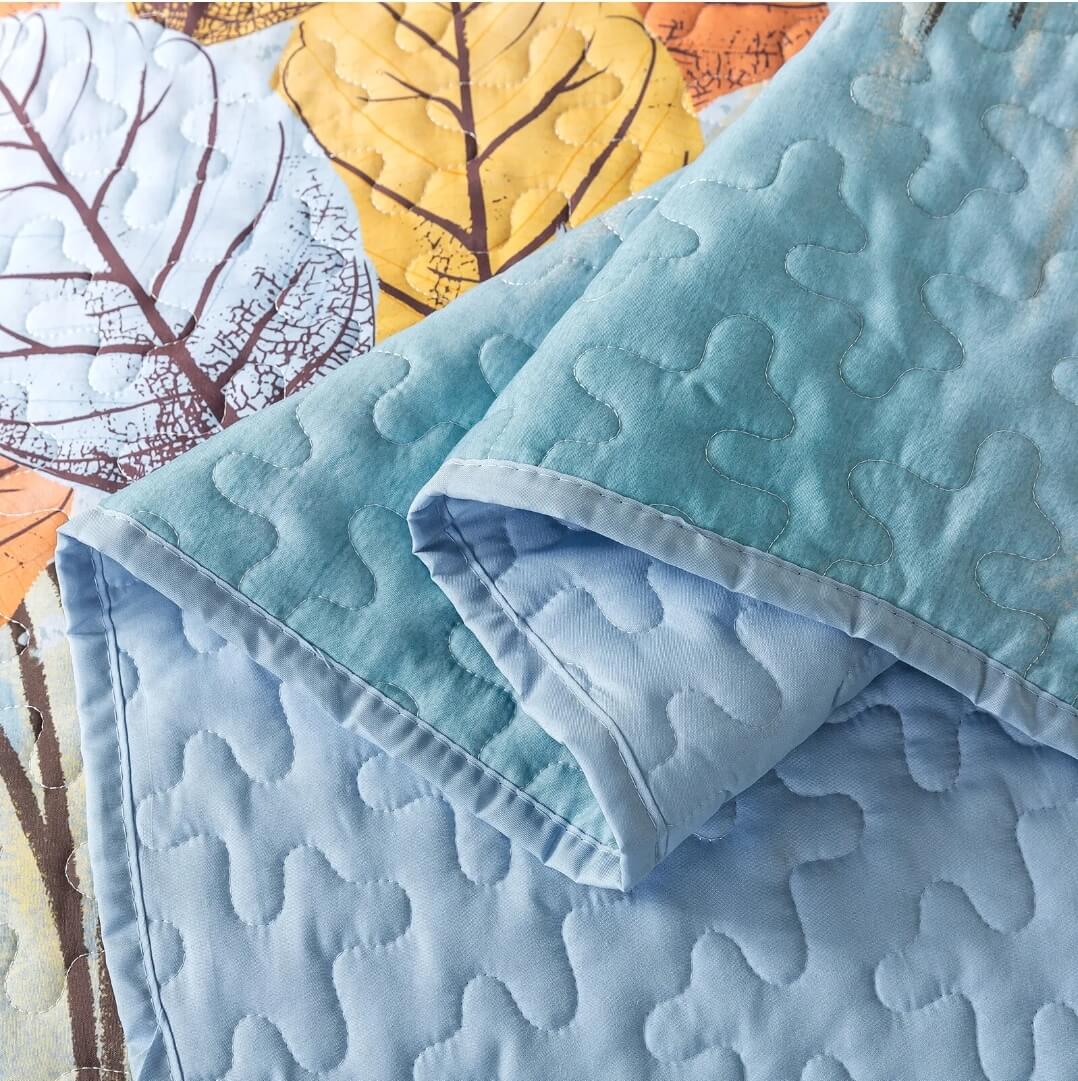 Blue pillow on a colorful quilt with leaf patterns